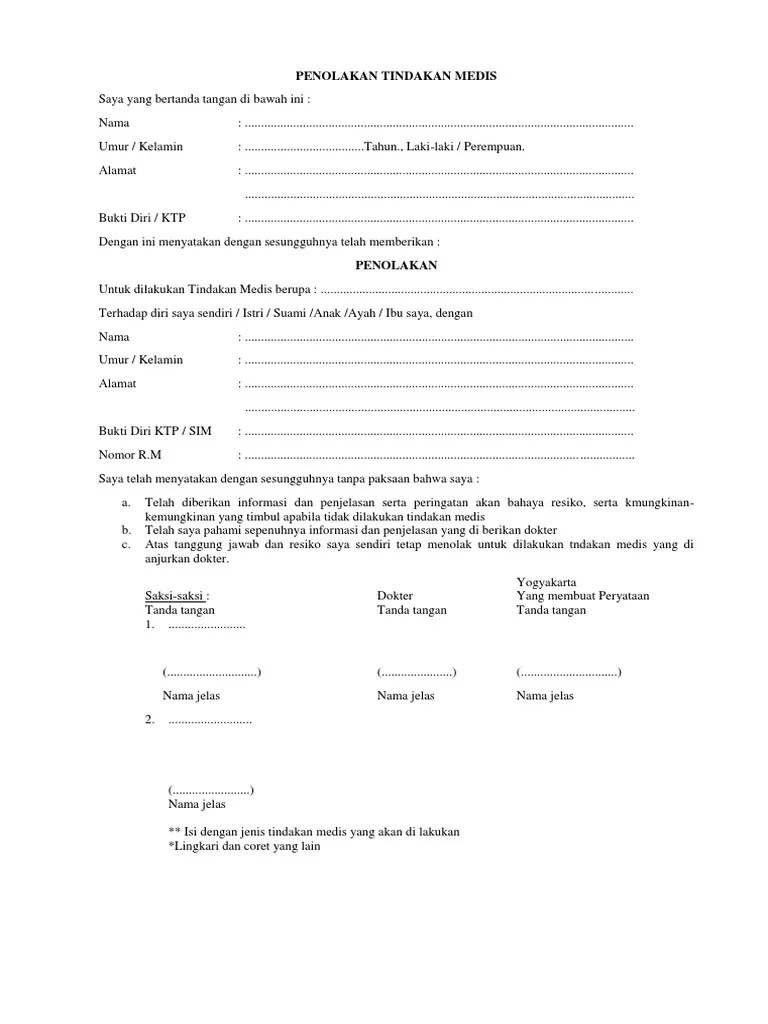 Implied consent adalah persetujuan yang diberikan pasien secara tersirat tanpa pernyataan tegas.isyarat persetujuan ini ditangkap dokter dari sikap dan tindakan pasien.umumnya tindakan dokter di sini adalah tindakan yang biasa dilakukan atau sudah diketahui umum.bentuk lain adalah ketika pasien dalam keadaan gawat darurat sedang dokter memerlukan tindakan segera ,sementara pasien dalam keadaan. Bismillaahirrahmaanirrohiim surat pernyataan menolak vaksinasi/imunisasi saya yang bertandatangan di bawah ini, surat pernyataan penolakan aster docx. Bertindak untuk dan atas nama: Serta tindakan medis yang akan dilakukan dan kemungkinana pasca tindakan yang dapat terjadi sesuai penjelasan yang diberikan.