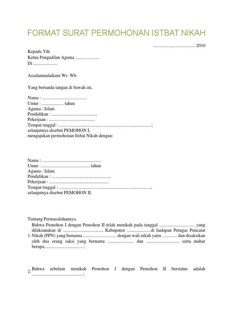 Kedua, kelalaian dari petugas atau imam desa untuk mendaftarkan. Format surat permohonan itsbat nikah digabung gugat cerai dan. Desa/kelurahan setempat kalau yang bersangkutan pernah menikah. Fotokopi ktp suami dan isteri yang di . Permohonan isbat nikah atau pengesahan nikah diajukan oleh pihak yang sudah menikah secara agama islam, namun tidak tercatat dan tidak memiliki buku nikah .