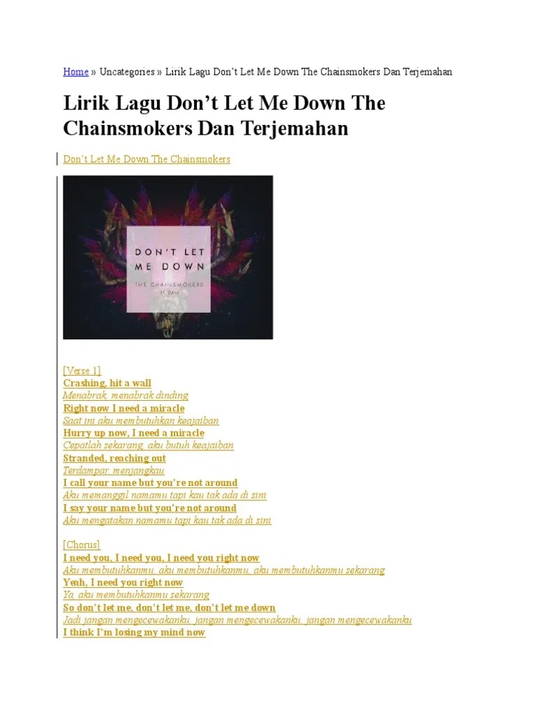 You have found her, now go and get her. Don't let me down, don't let me down. Don't let me down dan terjemahan crashing, hit a wall. Daya crashing, hit a wall hancur, menabrak dinding right now i need a mi. Terjemahan lirik lagu rock, metal, punk, screamo. Hey jude don't let me down. Right now i need a miracle Hei jude, jangan mengecewakan aku. The beatles dikenal sebagai band rock asal inggris sejak tahun 1960. Kamu telah menemukannya, kini kejar dan dapatkanlah . Saat ini aku butuh keajaiban. Right now i need a miracle.